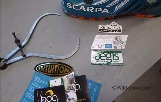 F1 的吊牌有很多值得一说,有趣的是他们确保了后“鞋底搁板”和靴口形状都跟 Marker Kingpin 固定器适配,防臭的内靴也不错(使用了 Aegis 材料),Dynafit 认证系统兼容也使其增值不少。