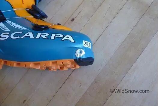 登山滑雪靴的技术挑战在于给鞋头脚趾下方提供足够的厚度,特别是使用 Dynafit Quick-Step-In® 系统的滑雪靴。SCARPA 这方面做得很好。鞋底材料可以说非常耐磨且不会打滑。